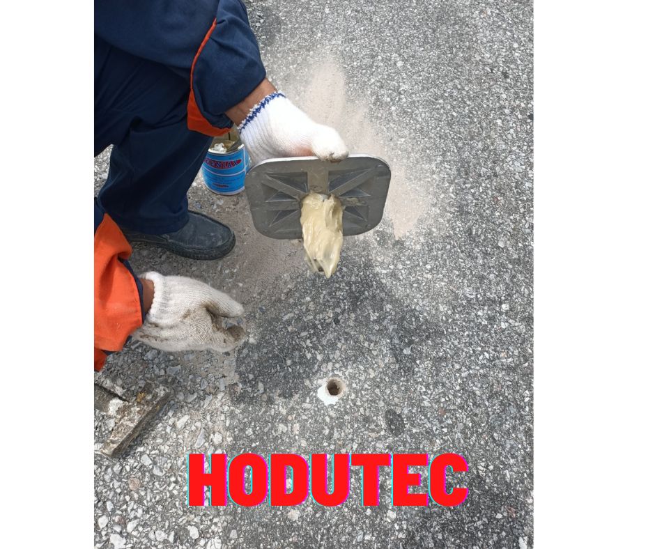 - Nếu lắp đặt đinh phản quang có chân, dùng máy khoan chuyên dụng cho mặt đường để khoan lỗ sâu 60mm, đường kính 28mm. Sau đó làm sạch bên trong và bề mặt lỗ khoan.